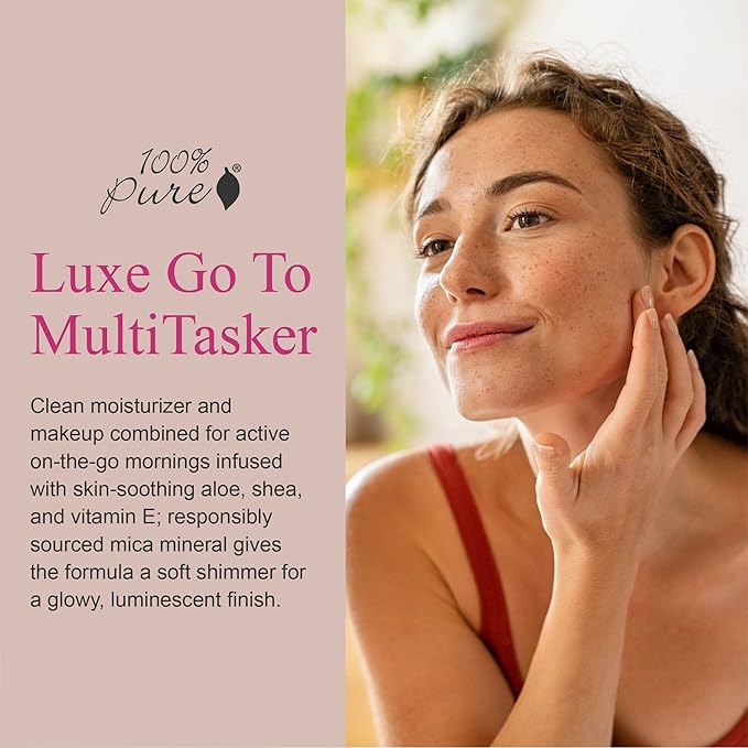 - LUXE GO TO MULTITASKER - Clean moisturizer and makeup combined for active on-the-go mornings infused with skin-soothing aloe, shea, and vitamin E; responsibly sourced mica mineral gives the formula a soft shimmer for a glowy, luminescent finish.