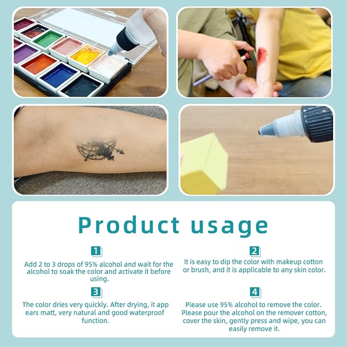 - 【Application】It can be used for special effect makeup, tattoo coverage, FX prosthesis, and it is very easy to master whether it is a performing arts worker or a makeup beginner. You only need to drop a few drops of alcohol in the paint grid before each use and wait for it to soak in, then you can paint with a paintbrush or cotton pad. After it dries, it will not fall off easily whether it is washed with water or sweated, so even in the Acrobats or action actors in the water can be used.