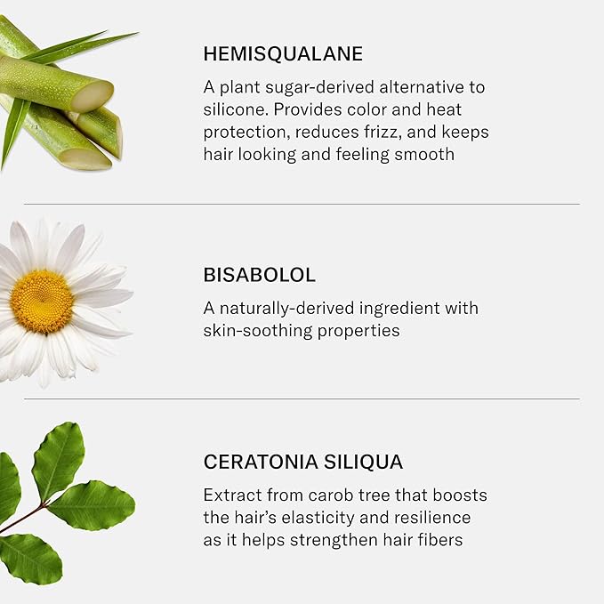 - Hero Ingredients: Hemisqualane – A plant sugar-derived silicone alternative that protects against color fading and heat, reduces frizz, and smooths hair. Bisabolol – A naturally derived ingredient with soothing benefits. Ceratonia Siliqua – Carob tree extract that boosts elasticity and strengthens hair. Moringa Oleifera – Horseradish tree extract that shields hair from pollution and UV rays. Squalane – A plant-based moisturizer that nourishes, restores shine, and adds softness.