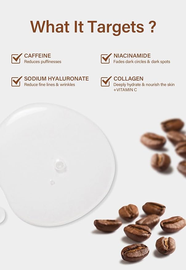 - What Caffeine Eye Mask Serum In: 100% safe and natural formula with caffeine,vitamin C,collagen,retinol,sodium hyaluronate and niacinamide as main ingredients which makes our eye treatment serum.Therefore, this eye treatment serum is good for sensitive skin, dry skin, oil skin,normal skin,combination skin,mature skin and uneven skin.perfect eye serum for women,girlfriend,mother and sister.