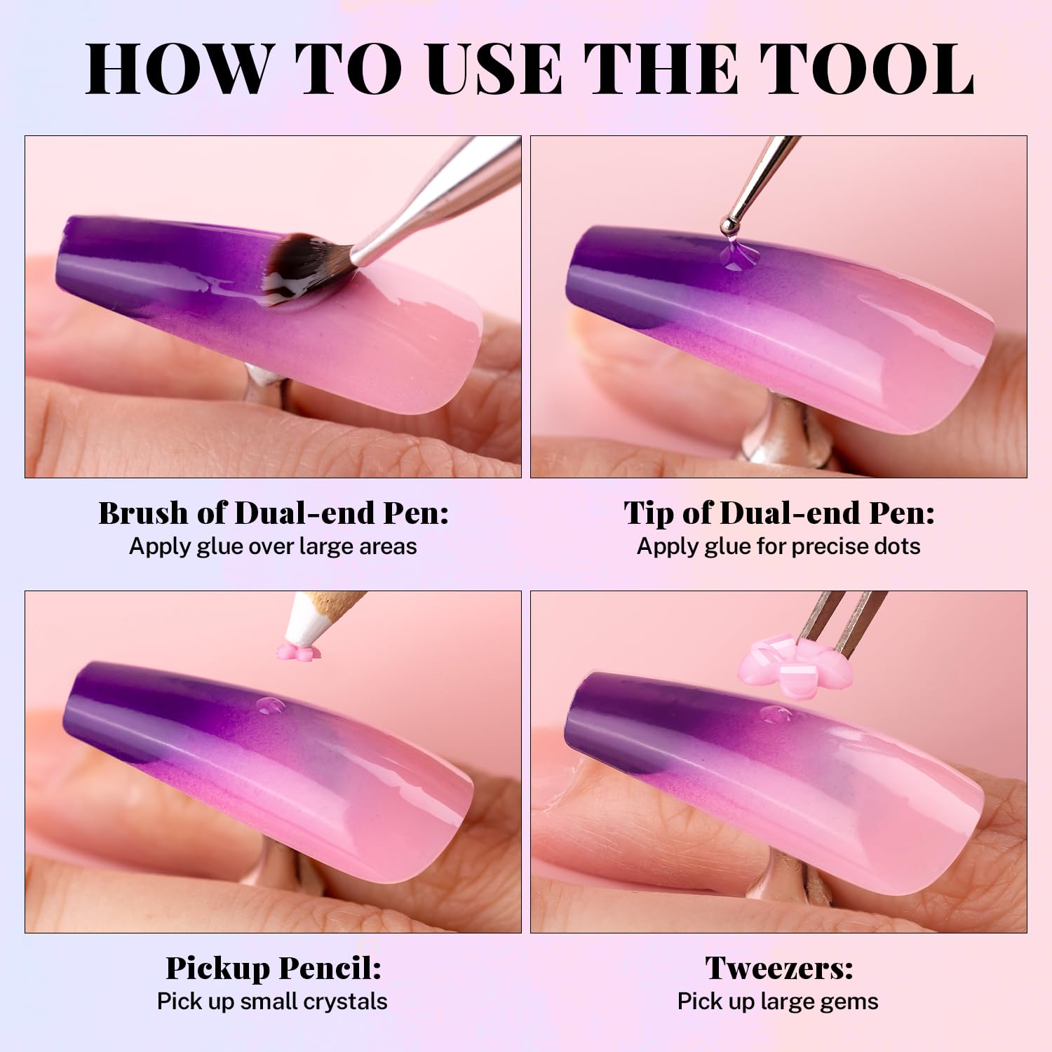 - đź’ŽRHINESTONE DOTTING PICKER TOOLS: The wide-head brush end of the dual-end dotting tool makes it easy to apply a large amount of glue to the nail surface at once, while the other mini dotting end is great for detailed drawing. Picker pencil can help you handily pick up small flowers and metal beads, while tweezer is a better choice for big flowers and beads. The craftbeads are not self-adhesive and glue-needed. (glue is not included.)