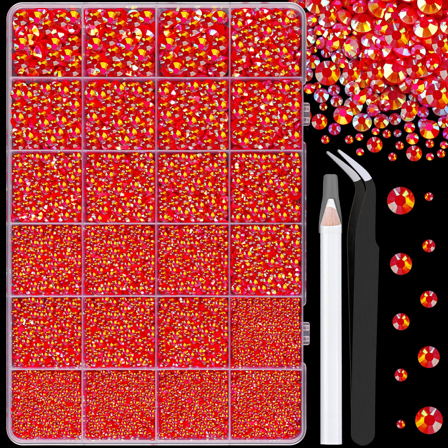 - đź’ŽPACKAGE CONTENT -- The package includes 1 box with 24 grids, featuring a variety of sizes: 2mm x 5 grid, 3mm x 6 grid, 4mm x 5 grids, 5mm x 5 grids, and 6mm x 3 grids, approx. 25000 pcs of 2-6mm bling-out resin rhinestones (Red AB). 1 tweezers and 1 pickup pen are included for easily picking up of rhinestones. The large amount will support you to fulfill a number of your wonderful DIY decoration ideas.