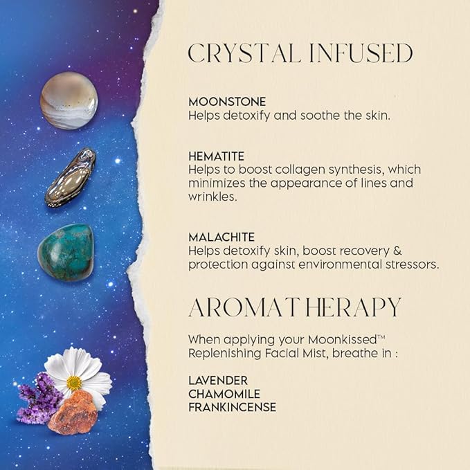- Botanical Infusion: This restorative hydrolat water mist, is formulated with botanical actives, crystal-derived mineral compounds and Rosa Damascena Water to rebalance and drench skin in moisture and soothing comfort.