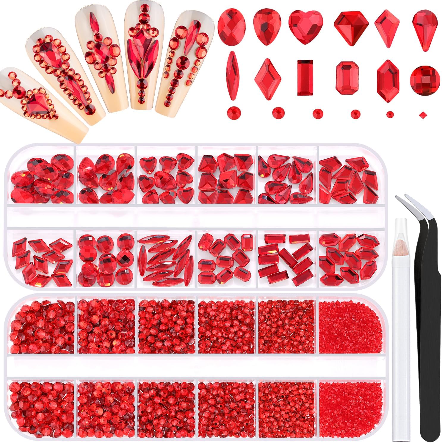 - đź’ŽPACKAGE CONTENT -- The package contains 120Pcs multi shapes flatback gems crystal and 2510Pcs 1.5-4mm round beads, totally 2630Pcs Red rhinestones. Additionally, 1 tweezers for large size gems and 1 pickup pen for small size gems. This rhinestones kit makes it easy for you to make any nail art you like, and will bedazzle your acrylic nails!