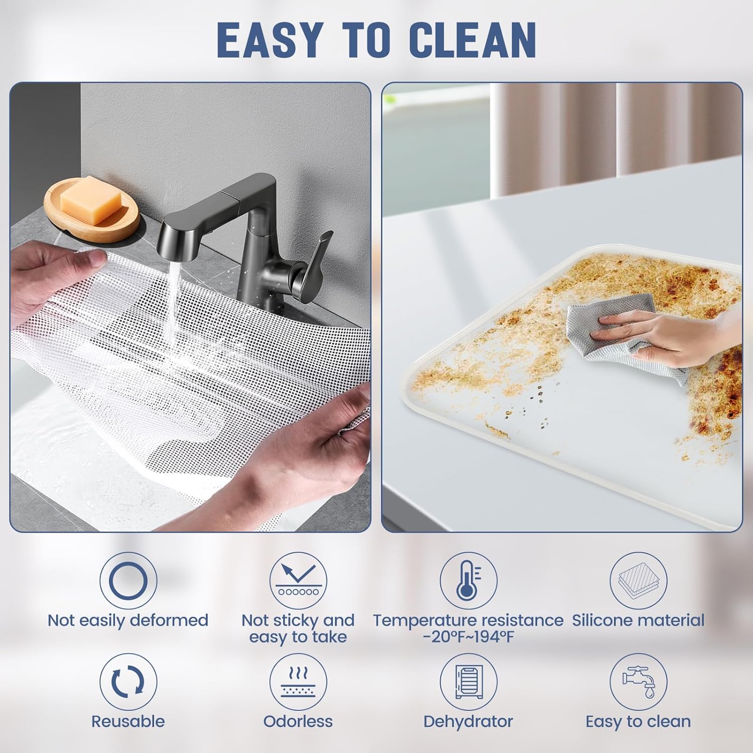 - 【EASY TO CLEAN】These dehydrator silicone trays help keep our dehydrated food from sticking to the shelves.It can be washed at the sink and dishwasher with just regular dish soap and warm water,so much easier than having to wash the dehydrator shelves