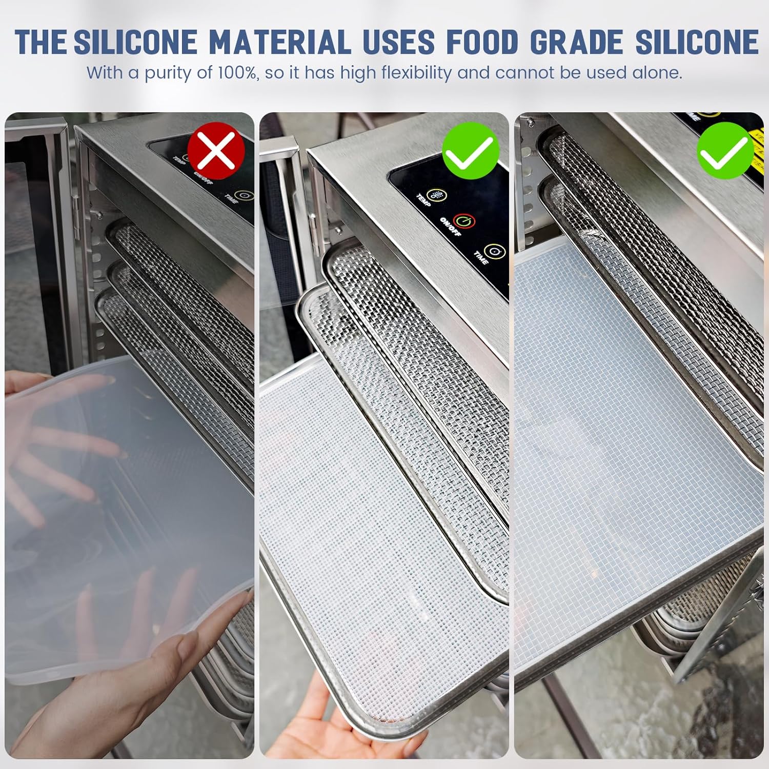 - 【Food GRADE SILICONE】Silicone dehydrator trays are made of 100% BPA-free natural silicone,color-free,non-toxic and non-stick.Pure silicone has high softness,so needs to be used in conjunction with stainless steel trays.Suitable for low & high temperatures