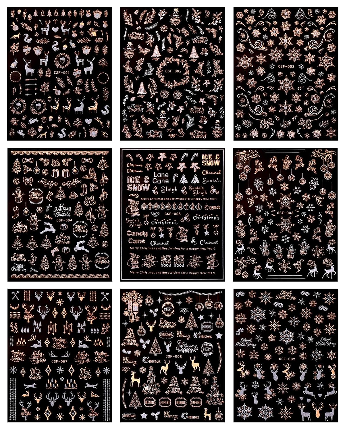 JMEOWIO 9 Sheets Christmas White Glitter Nail Art Stickers Decals Self-Adhesive Snowflake Winter Holiday Rose Gold Nail Supplies Nail Art Design Decoration Accessories