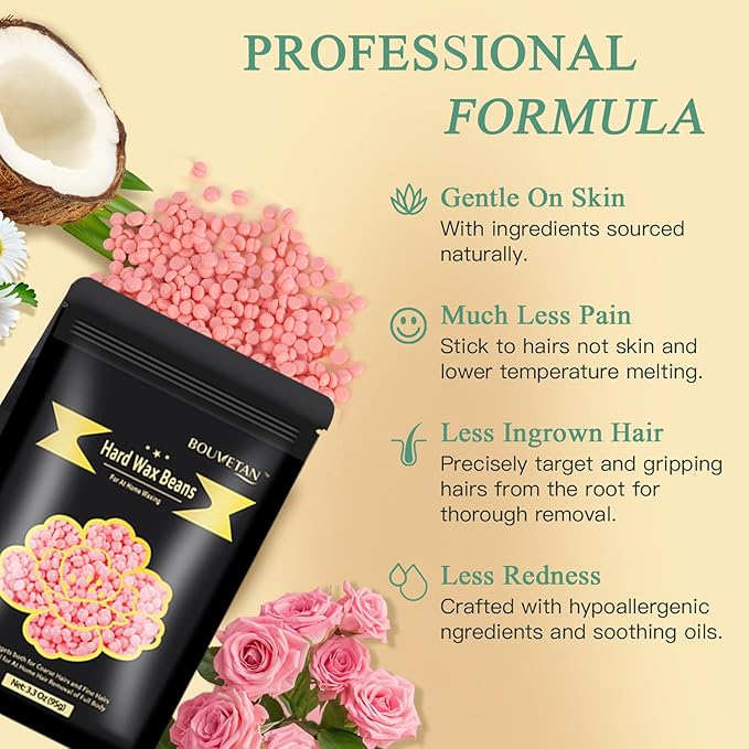 - 【Waxing Beads for Sensitive Skin】BOUVETAN hard wax beans are specifically formulated with hypoallergenic ingredients. They are meticulously designed for sensitive areas hair removal like the bikini line and underarms