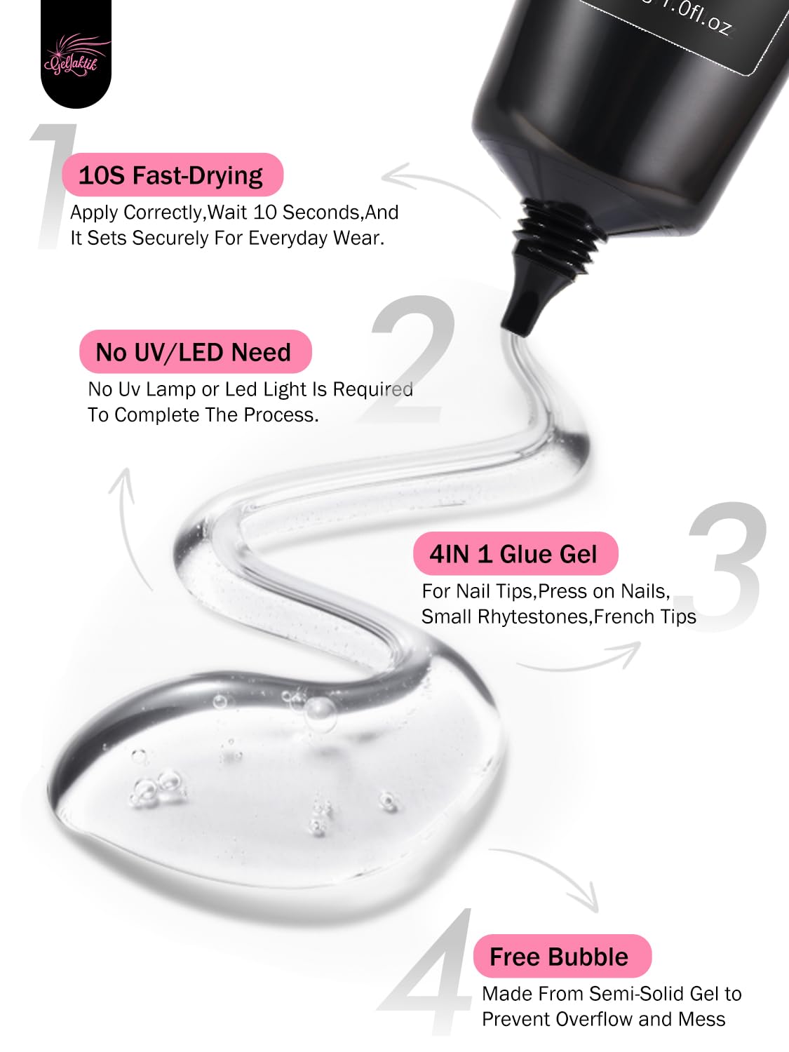 - 【QUICK AIR DRY】:GELLAKTIK nail glue gel for press on false nail tips, will air dry in 10s, WITHOUT any UV/LED lamp curing. Please apply suitable amount for full cover at first.