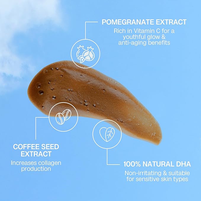 - 𝗡𝗼𝘂𝗿𝗶𝘀𝗵𝗶𝗻𝗴 𝘀𝗸𝗶𝗻𝗰𝗮𝗿𝗲 𝗯𝗲𝗻𝗲𝗳𝗶𝘁𝘀: Our tanning mousse is infused with natural DHA and enriched with skin-loving ingredients, including chamomile extract, coffee seed extract, and pomegranate extract. This delivers a flawless tan and also nourishes and conditions your skin.